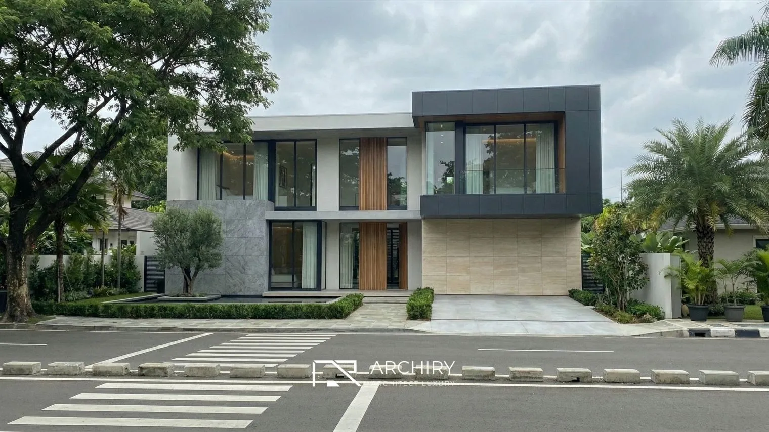 BY House merupakan perwujudan hunian yang menonjolkan kekayaan material lokal dalam desain kontemporer. Fasadnya dicirikan oleh blok kayu vertikal yang ikonik dan dinding batu alam yang memberikan kesan kokoh. Di bagian dalam, ruang keluarga dan area makan dirancang tanpa sekat, memaksimalkan pandangan ke arah taman melalui dinding kaca besar. Setiap ruangan dipadukan dengan pencahayaan hangat untuk menonjolkan tekstur dinding batu, menciptakan kedalaman visual yang memukau.