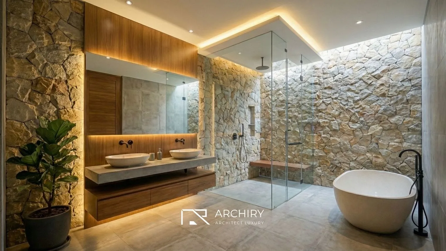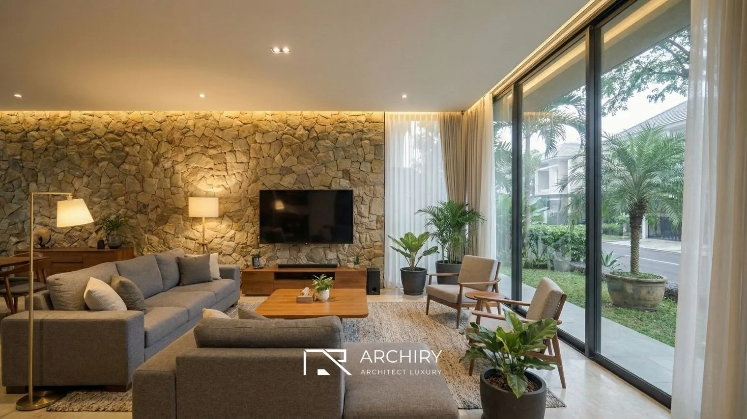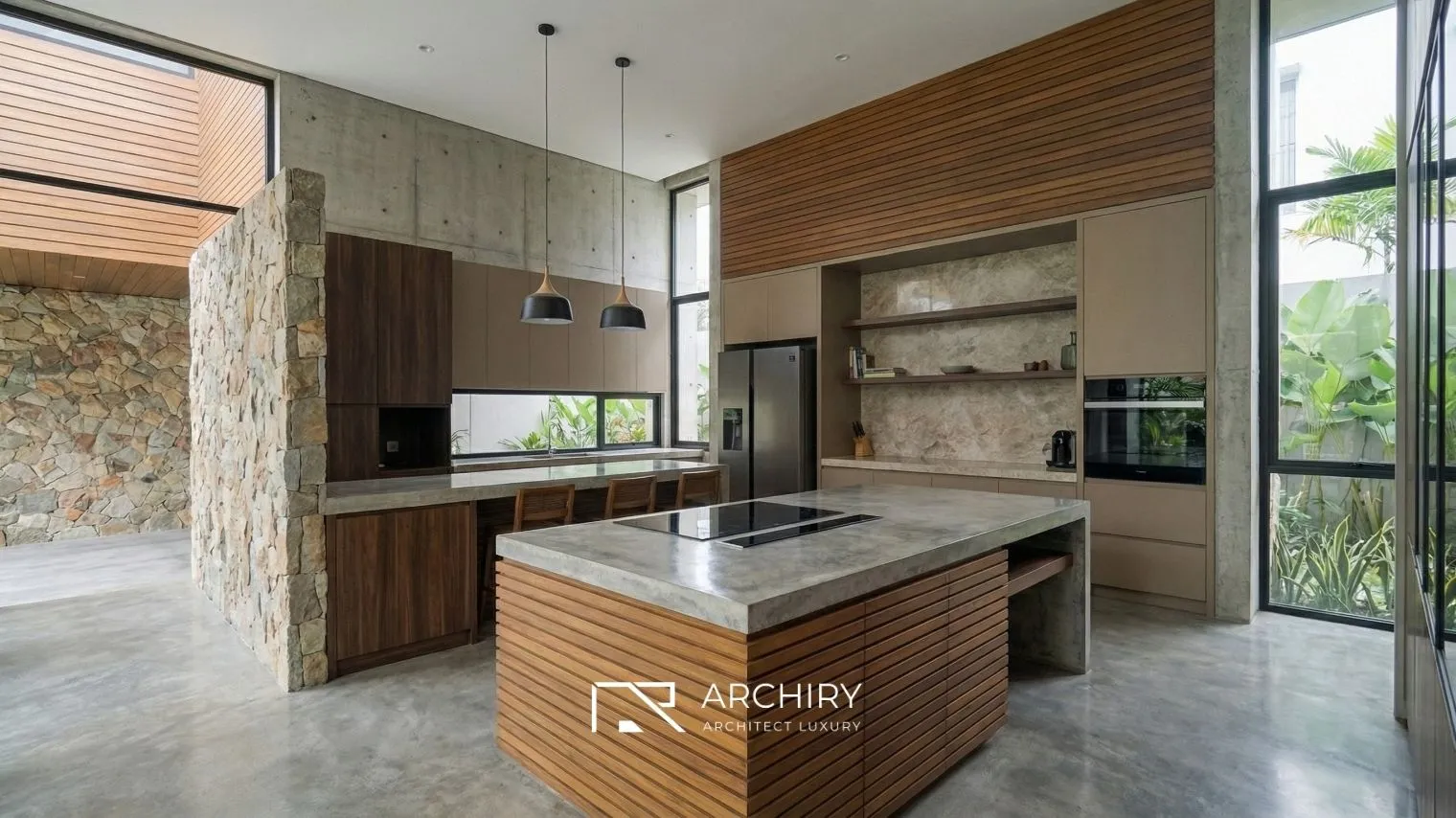 Ingin membangun hunian dengan detail material alam yang menonjol seperti ini? Wujudkan bersama tim profesional kami melalui Jasa Bangun Rumah Archiry untuk hasil yang presisi dan berkualitas.