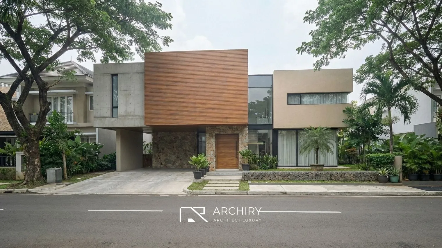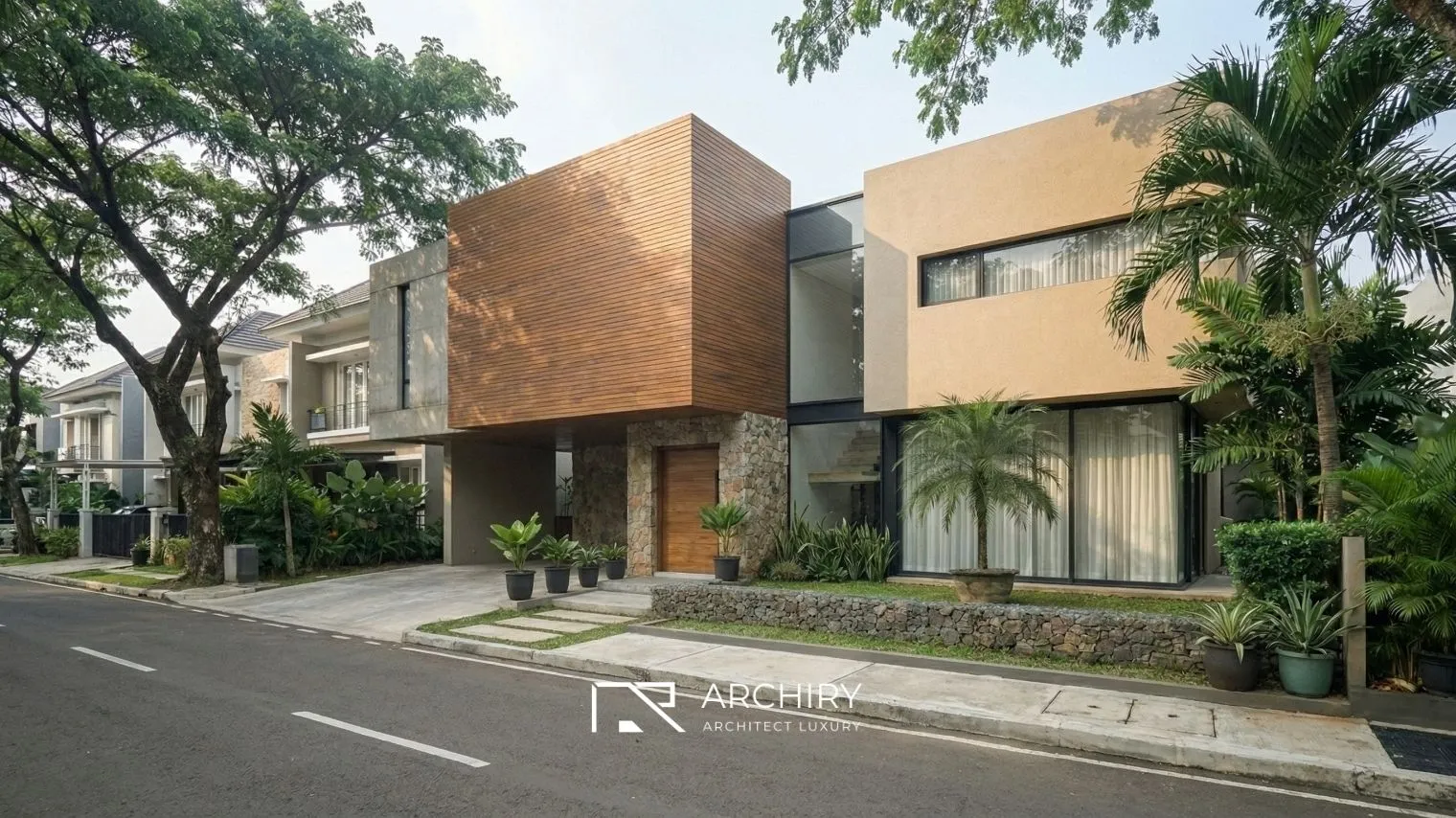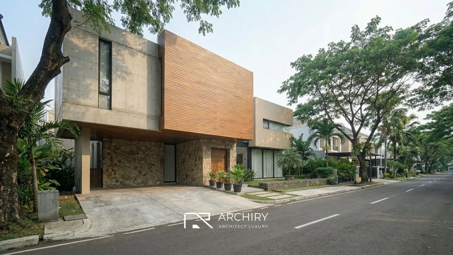 Ingin membangun hunian dengan detail material alam yang menonjol seperti ini? Wujudkan bersama tim profesional kami melalui Jasa Bangun Rumah Archiry untuk hasil yang presisi dan berkualitas.